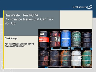 This list has a bit of overlap with common RCRA violations, but these are ten issues that hazardous waste generators might overlook during their routine inspections or audits. They are common issues I observed or noted during my almost 30 years of inspections and audits as a regulator with the Missouri Department of Natural Resources. I recently presented these issues in an eight-minute overview at the 2014 Mid-America Environmental Compliance Conference in Overland Park, Kansas, and in much more depth at the 2014 Greater Ozarks Environmental Summit in Springfield, Missouri. Above, you can see the slides from my eight-minute overview.