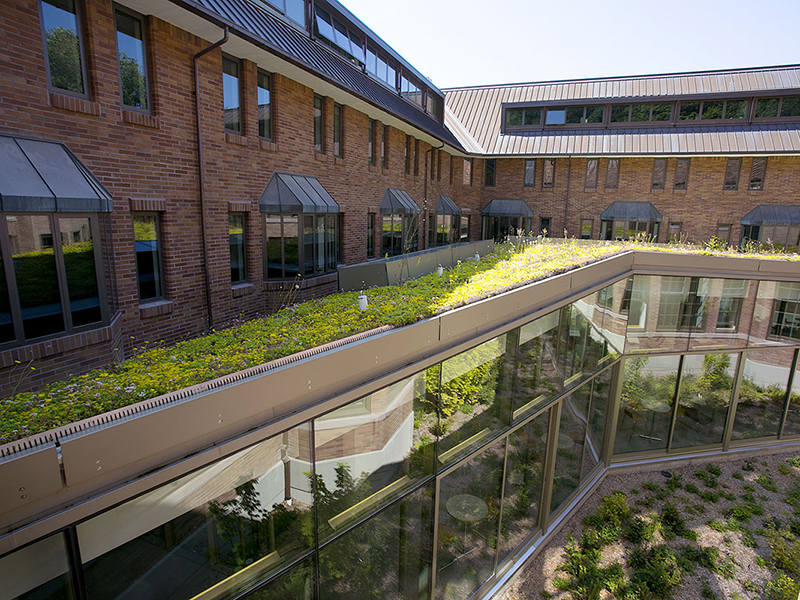 The updated 134,000 square-foot building incorporates a number of sustainable features and practices. Especially notable is a “green roof” that crowns a new student gathering place and saves heating and cooling costs, insulates sound and reduces stormwater runoff.