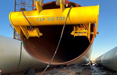 The project included large precast elements that required specialized equipment and careful planning, including this extremely robust below-the-hook lifting bar used to hoist 12-foot-diameter monopiles.